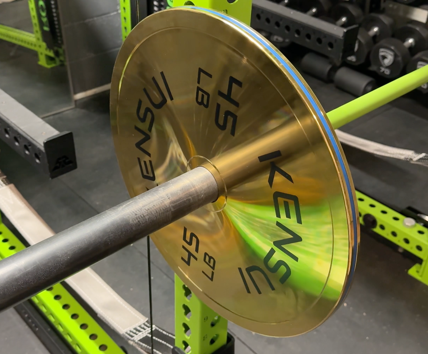The Kensui calibrated gold plates are thin, steel calibrated plates with a gold finish. Visually, they're aggressive. If you're building a gym with a deliberate aesthetic and gold fits your setup, these plates look excellent. They sit tight on the sleeves with minimal lateral movement, and they slide on and off easily.